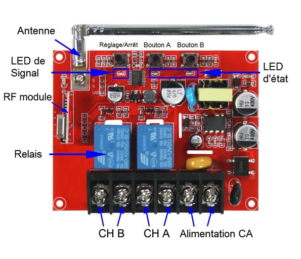 Presser le bouton 2 de l'émetteur ou le bouton B du récepteur: Le relais 2 est