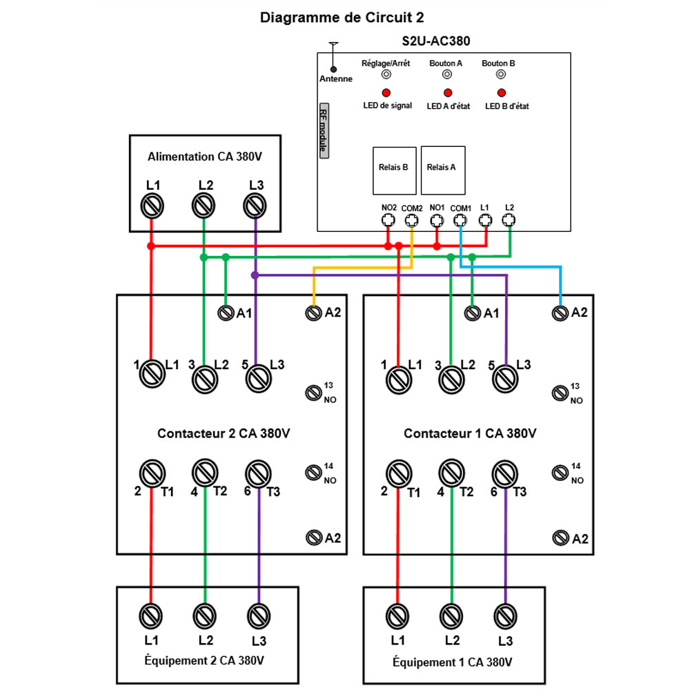 récepteur, le contacteur CA 380V, l'équipement CA 380V et l'alimentation en CA