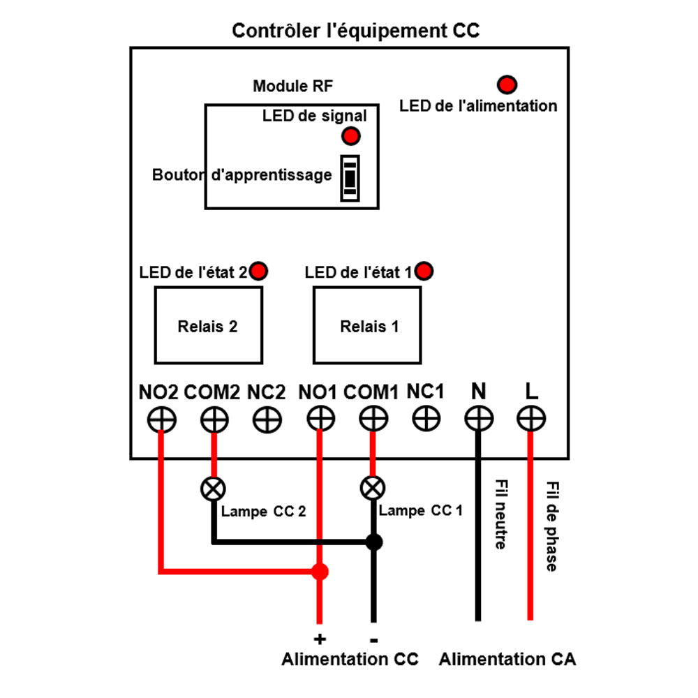 pour contrôler à la fois les équipements CC et AC. Les bornes de sortie sont