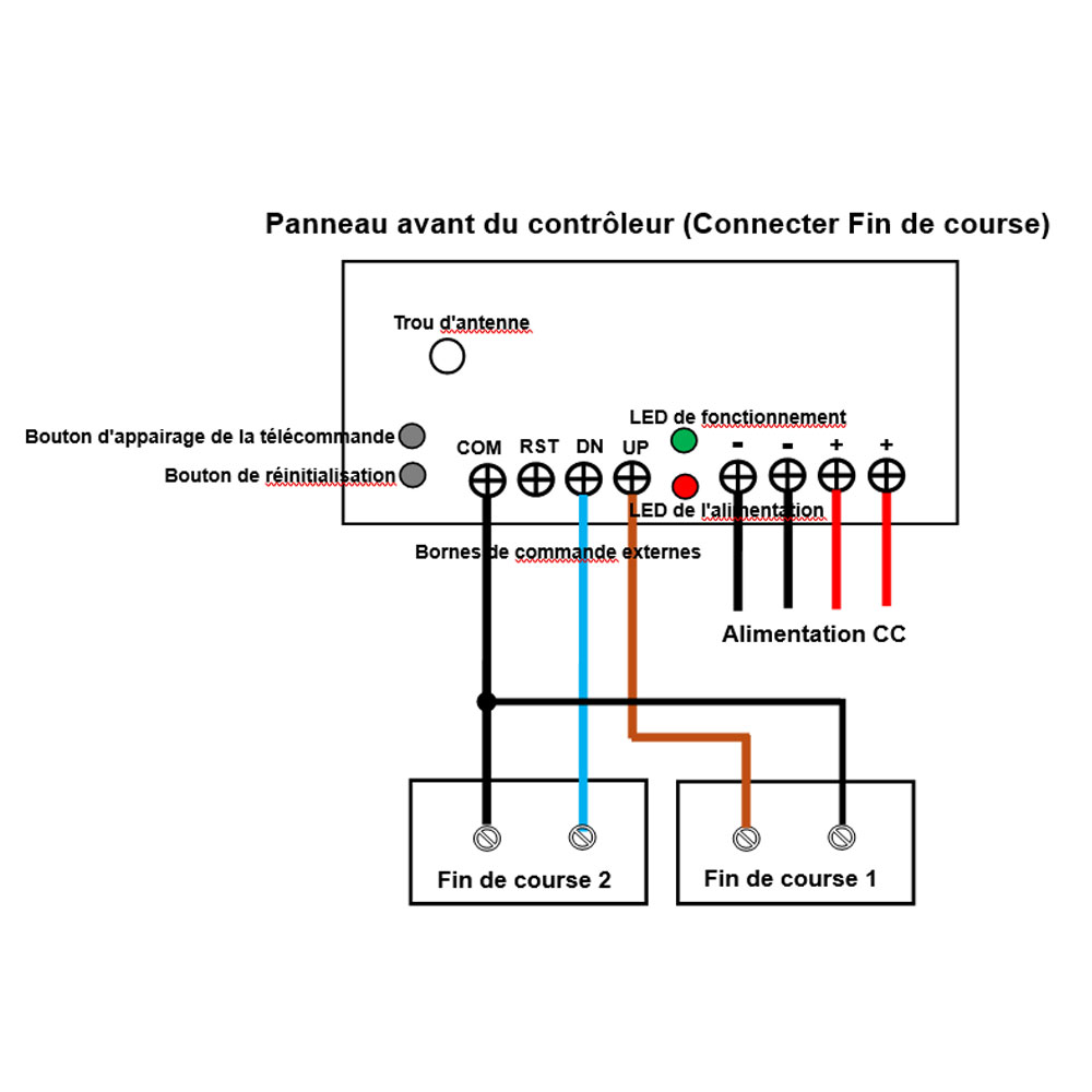 1) Vous pouvez connecter deux interrupteurs de fin de course, et chaque
