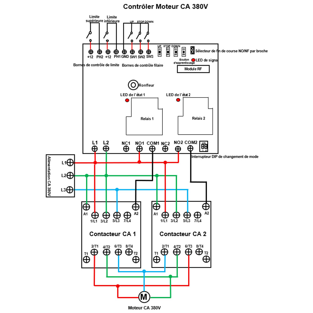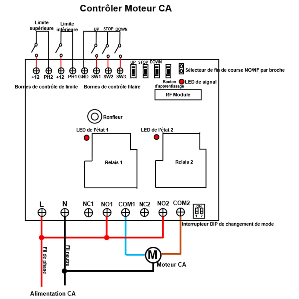 1) Mode momentané: Par exemple, connectez un interrupteur manuel à 2 boutons